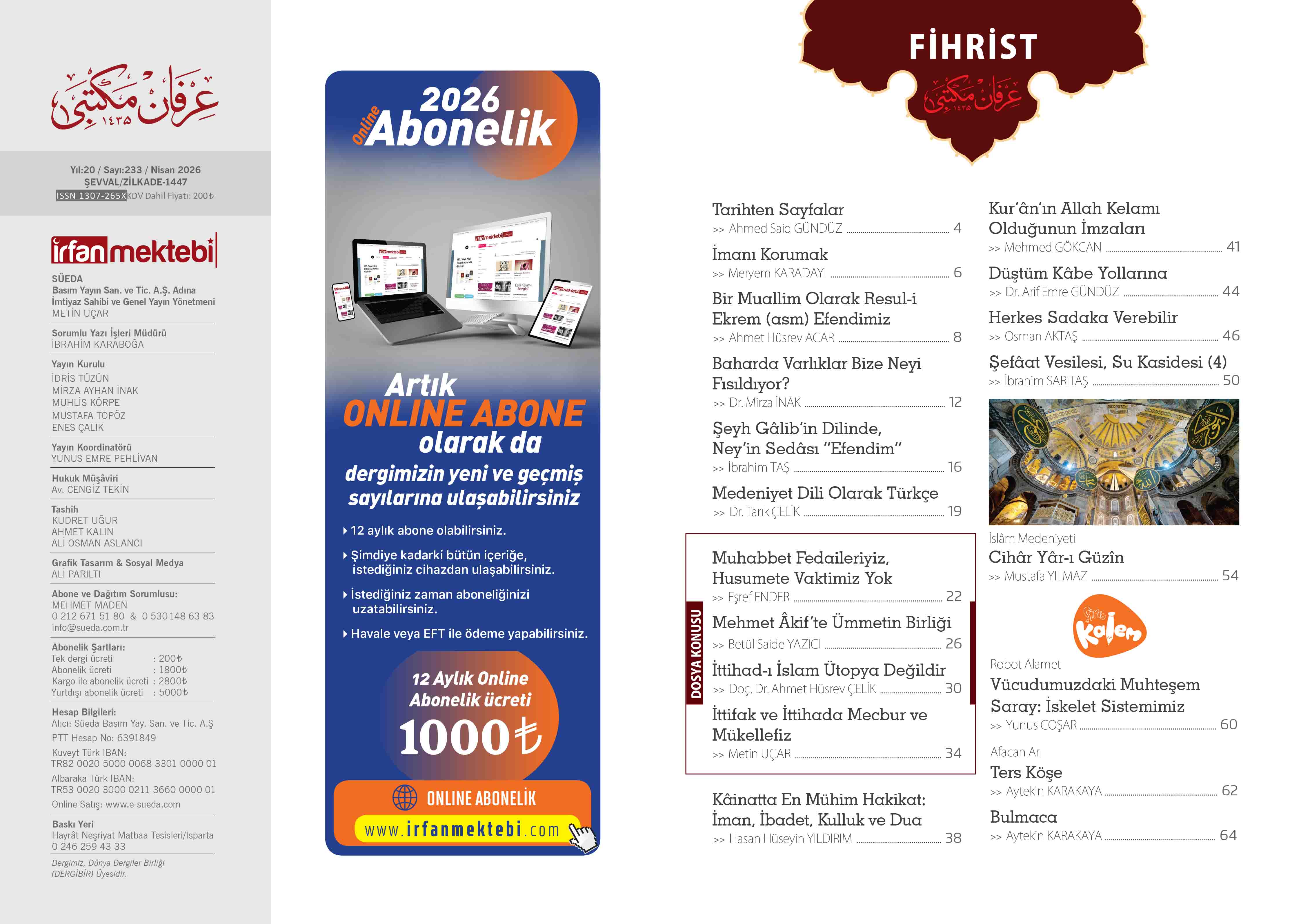 Bu sayımızda yer alan yazılar aynı hakikati farklı yönlerden ele alıyor. Mehmet Âkif’in ümmet birliğine dair fikirleri, bize yalnız bir şairin hissiyatını değil, bir devrin acısını da gösteriyor. Âkif, asıl tehlikenin sadece dış baskılar değil, içeride kardeşlik bağlarının zayıflaması olduğunu hatırlatıyor. Kavmiyetçiliğin, ayrışmanın ve iç çekişmenin ümmeti içeriden çökerten bir yara olduğunu açıkça söylüyor.