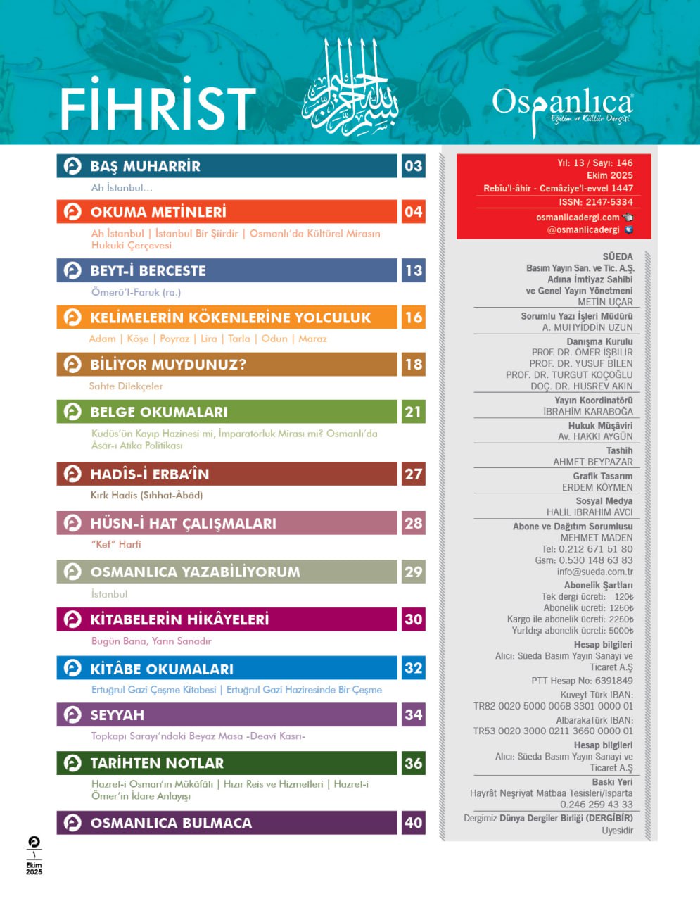 بزلر ده بو صاييمزده استانبولي هم كوزللگیله هم ده كولتور و اگیتیم دنيامزدەكي يريله اله آلییورز. چونكه عثمانلیجه أوگرنمك، اصلنده استانبولي يڭيدن اوقومقدر. بو شهرڭ طاشنه قازينمش كتابەلري، جامعلرنده صاقلی خط لوحەلرینی، كتبخانەلرندەكي یازمه أثرلری آڭلامق؛ بر باقیمه استانبولڭ حافظەسني ديريلتمكدر. حرفلری طانیمق، سادەجه دیل أوگرنمك دگل؛ بر مدنیتڭ آیینەسنه باقمقدر.